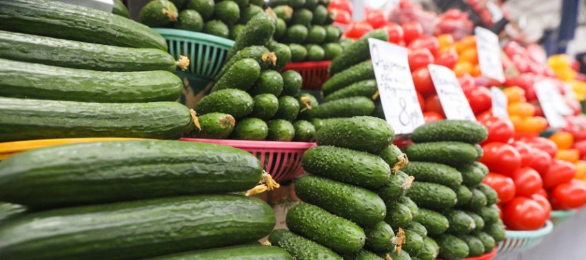 На овощных рядах сейчас хорошо берут томаты и огурцы. Разрыв в цене на первые заметный: есть варианты и за 3, и за 8 рублей. Гладкие огурцы стоят в районе 6 рублей за кило.