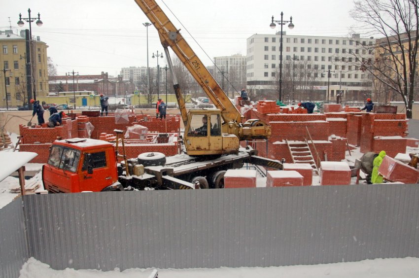 Сейчас ведутся работы по строительству стен первого этажа колокольни. Они собираются из красного кирпича. Выдал ли КГИОП разрешение на эти работы, оперативно выяснить не удалось. Информационного щита корреспондент «Канонера» не увидел.