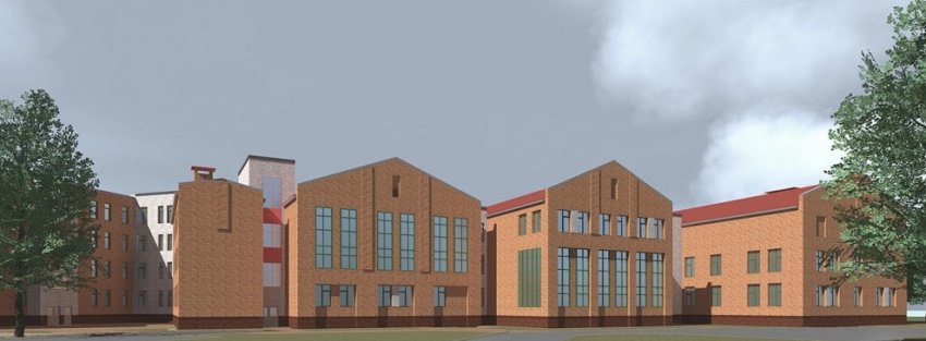 В исполнении ОАО «ЛенНИИпроект» получилась четырехэтажка сложной формы, облицованная красным кирпичом. Некоторые крылья получат треугольное завершение. Учиться тут смогут одновременно 825 человек.