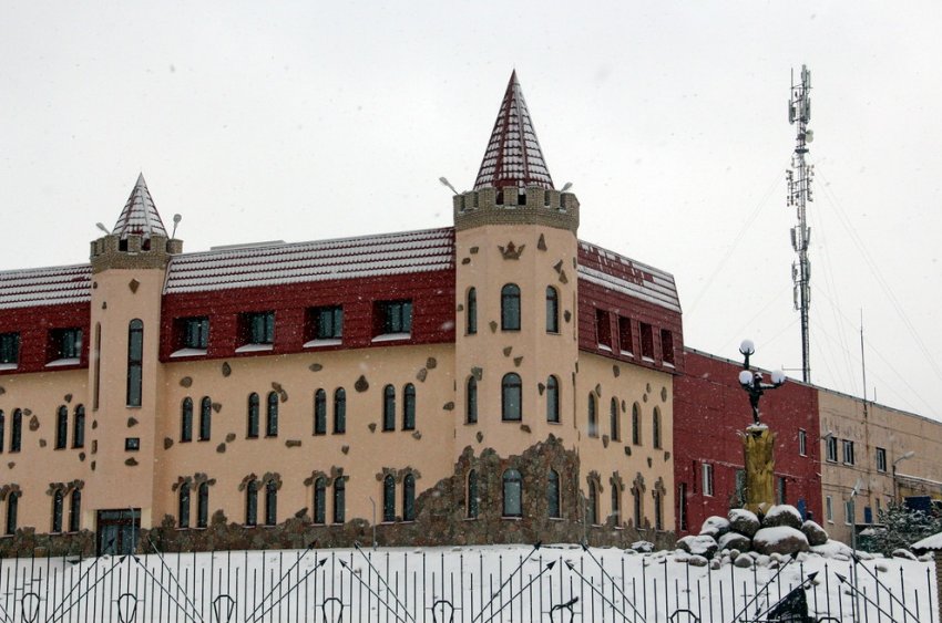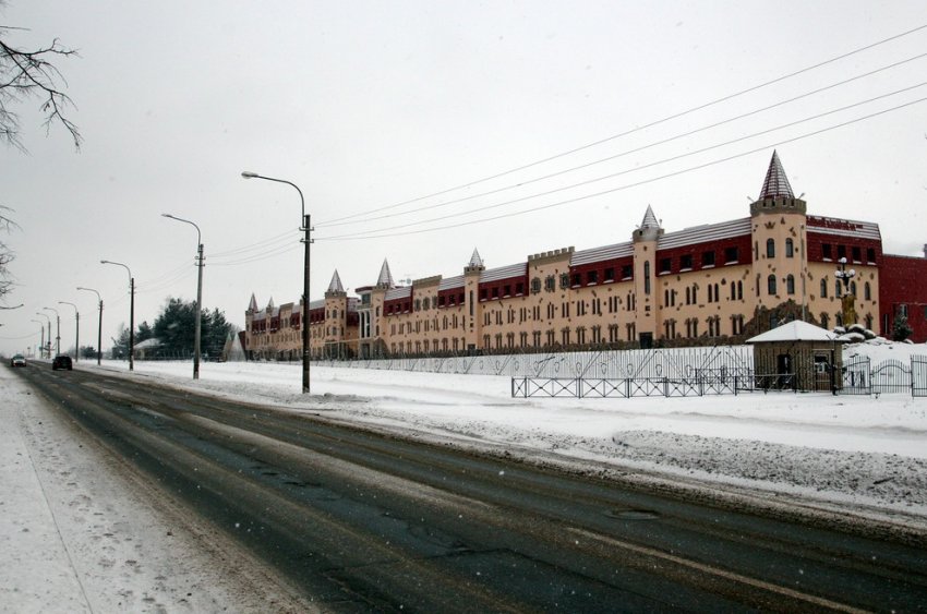 Лицевая часть завода «Каплист» на Кузьминском шоссе, 66, в Пушкине стала гостиницей. К бетонным промышленным корпусам пристроили стены из пенобетона и превратили в замок с башнями.