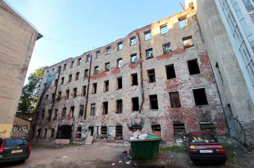 Сгоревший много лет назад дворовый флигель на Большой Разночинной улице, 6, решили продать с торгов. Вероятнее всего, покупатель снесет здание, а взамен построит новое.