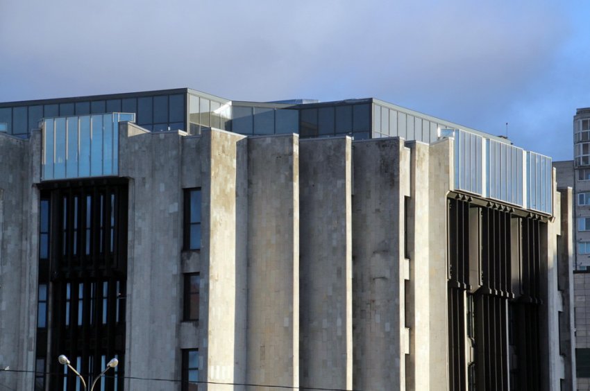Следом началась реконструкция южной половины здания, выходящей к Московскому шоссе. Помимо надстройки шестого, стеклянного этажа, проектом было предусмотрено возведение нового корпуса во дворе.
