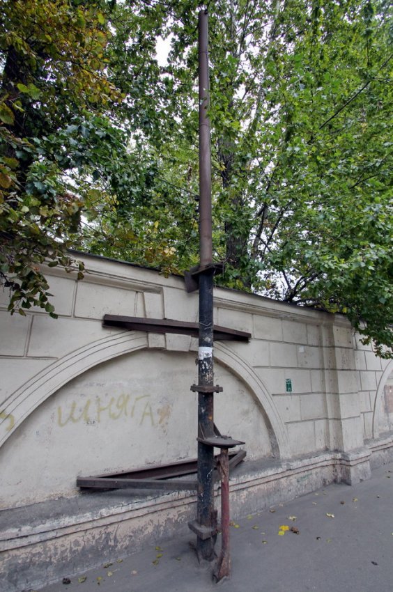В ходе благоустройства территории между жилым домом и Лесным проспектом демонтировали краеведческую достопримечательность — последний элемент железнодорожного переезда, который здесь существовал, а именно металлический столб, который крепился к забору.