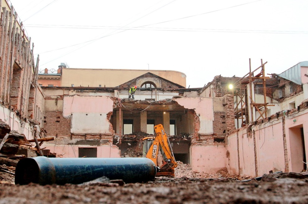 Кинематограф-памятник на углу Лермонтовского проспекта и Садовой улицы потрошат: внутренняя часть разобрана до земли. Так проходит реконструкция здания для нужд Мариинского театра.