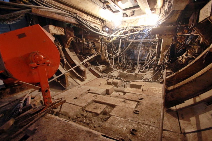 С одним из проходческих щитов по имени «Петровна» нас познакомили лично. Это целый комплекс весом примерно 150 тонн, состоящий из металлического ротора с резцами, конвейером для грунта и кабиной управления. Щит проходит грунт, нарезает его на части, которые по конвейеру отгружаются в вагонетки. Одновременно возводятся своды тоннеля, чтобы не допустить его обрушения.