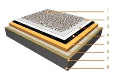 ![]() | 1 – пригрузочный слой (балласт); 2 – разделительный слой; 3 – гидроизоляция PLASTFOIL®; 4 – разделительный слой; 5 – ПЕНОПЛЭКС®; 6 – пароизоляция; 7 – уклонообразующая цементно-песчаная стяжка; 8 – несущее основание под кровлю (ж/б плита). |